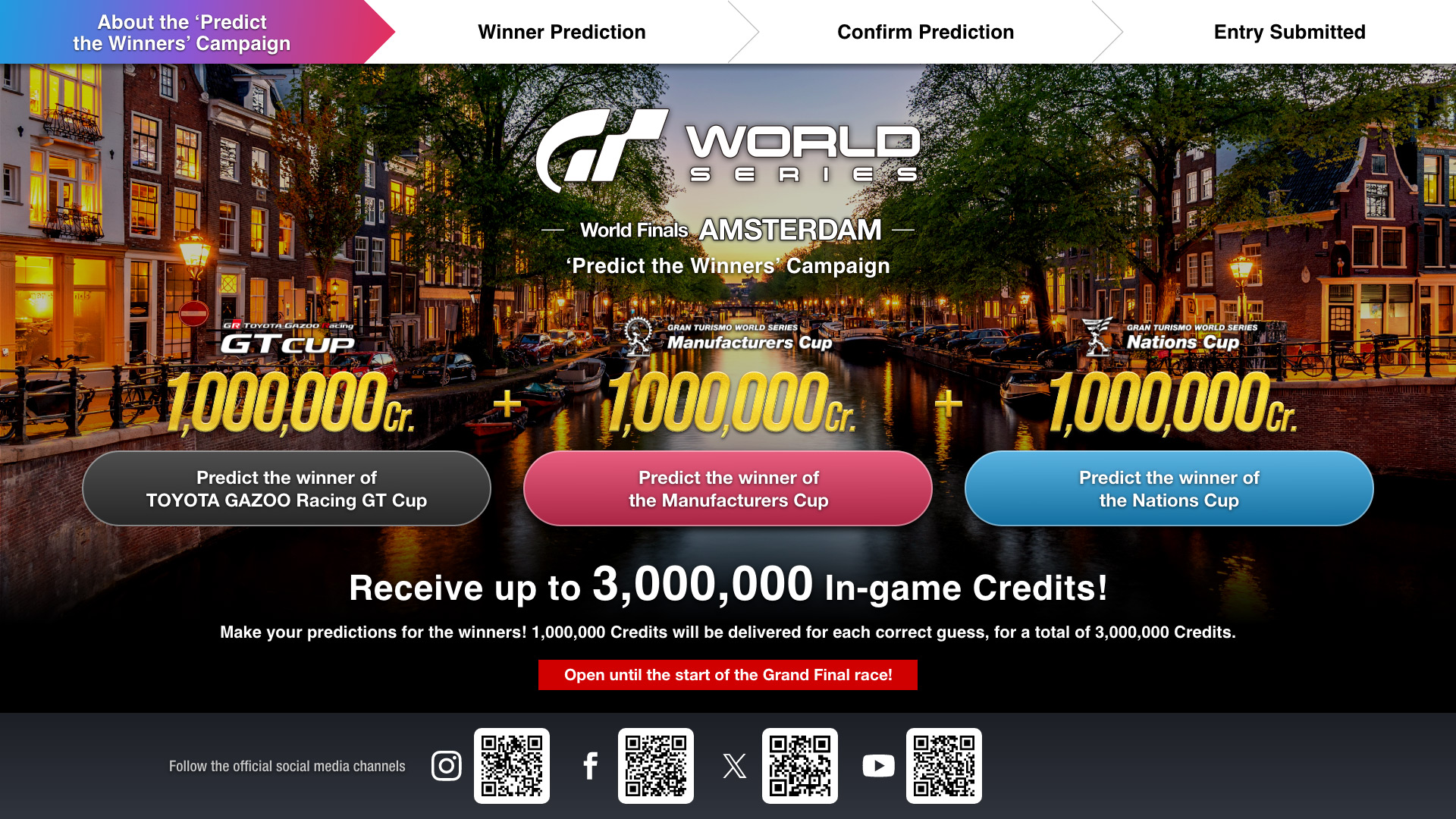参与Gran Turismo世界系列赛2024世界总决赛 - 阿姆斯特丹“优胜者竞猜”活动,获得最多300万游戏内货币!