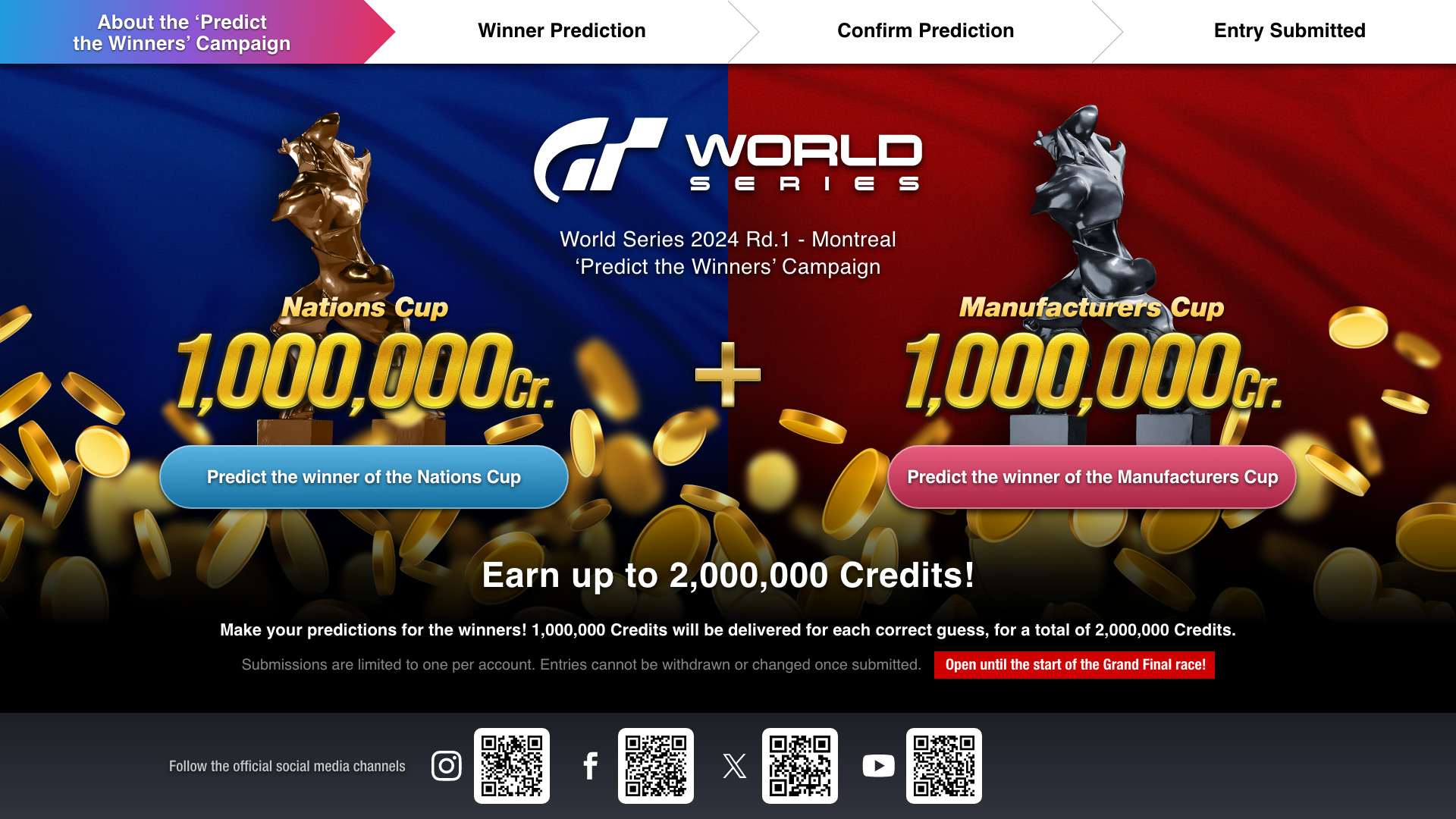 在此活动中,玩家只要正确预测本轮比赛中“车厂杯”和“国家杯”的优胜者,就能赢得游戏内货币奖励。正确预测一场赛事将获得100万货币奖励。如果成功预测全部两项赛事的优胜者,将总计获得200万货币。