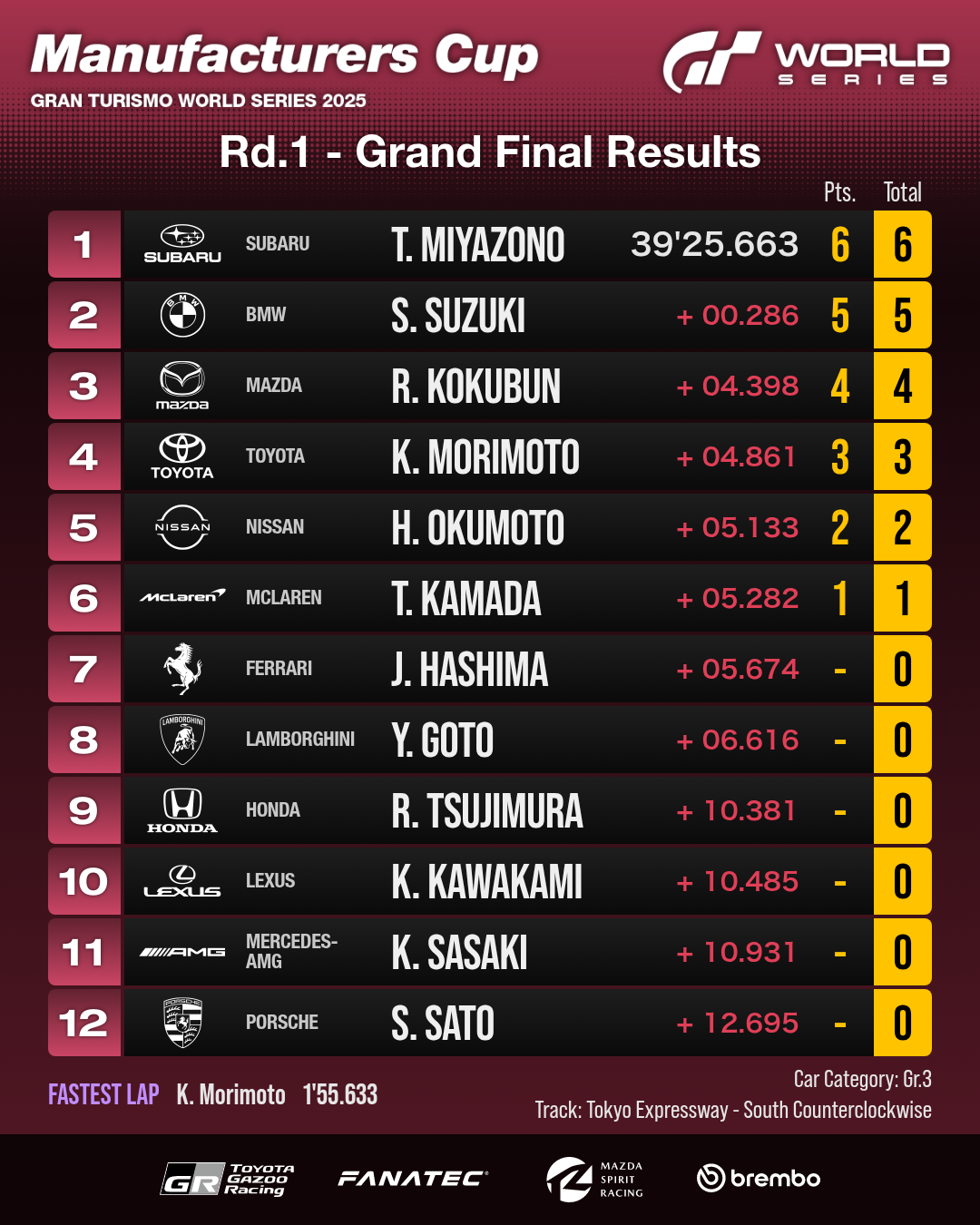 第1名 / Subaru / Takuma Miyazono (Kerokkuma_ej20) / 39’25.663