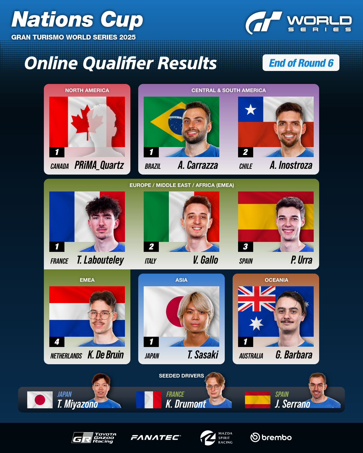 Gran Turismo世界系列赛2025在线预选赛——国家杯的最后一轮比赛已于5月10日结束,晋级世界系列赛第1至3轮比赛及世界总决赛现场赛事的十二位车手名单已确定。