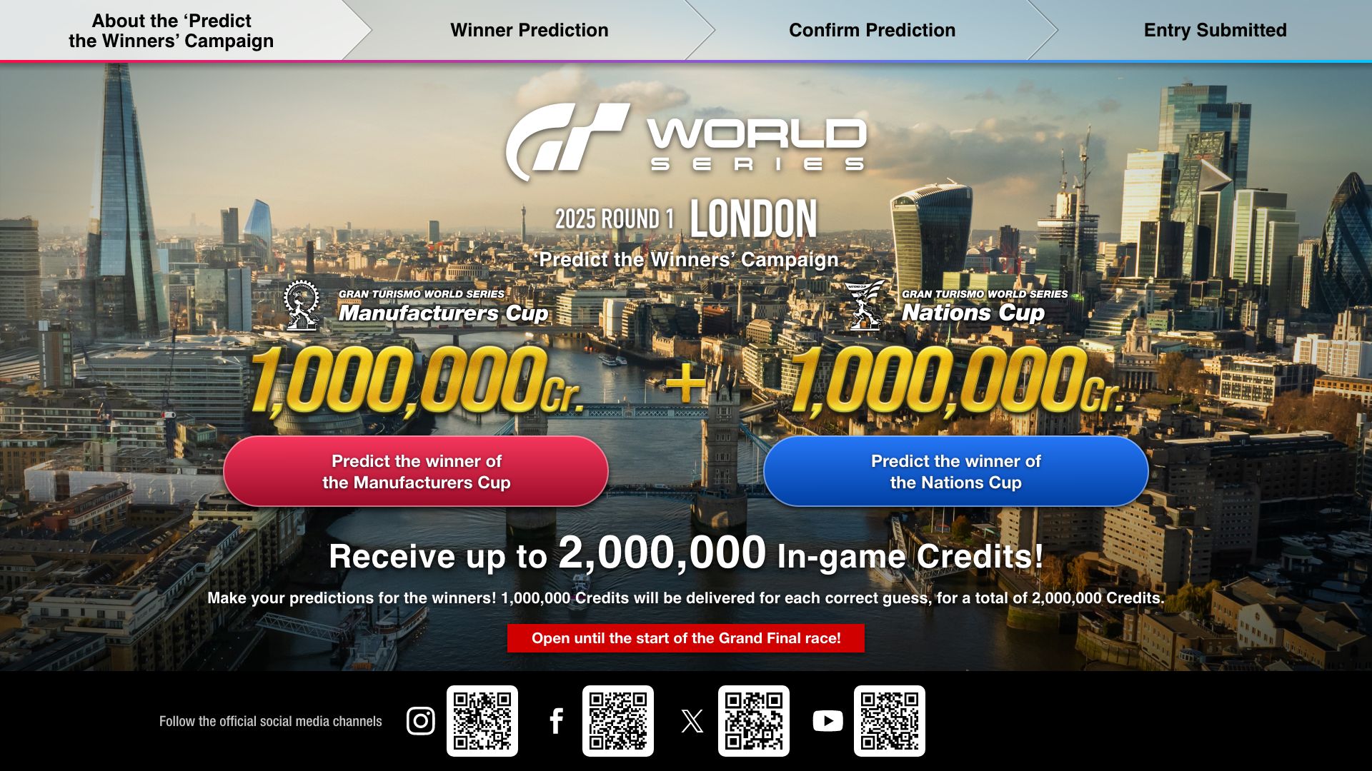 参与Gran Turismo世界系列赛2025第1轮——伦敦“优胜者竞猜”活动,赢取最多200万游戏内货币!