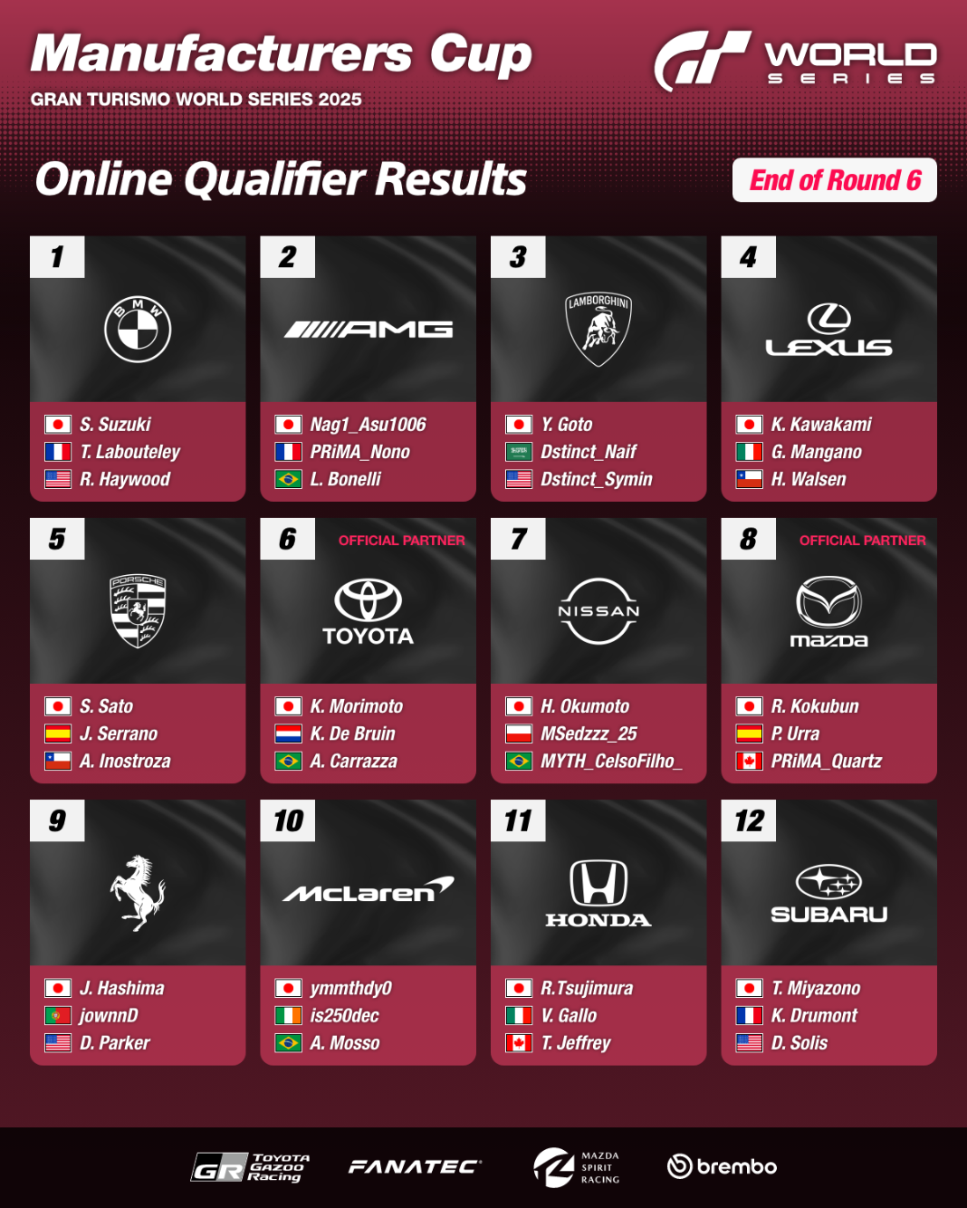 Gran Turismo世界系列赛2025在线预选赛——车厂杯的最后一轮比赛已于4月19日结束,晋级世界系列赛第1至3轮比赛及世界总决赛现场赛事的十二家车厂名单已确定。