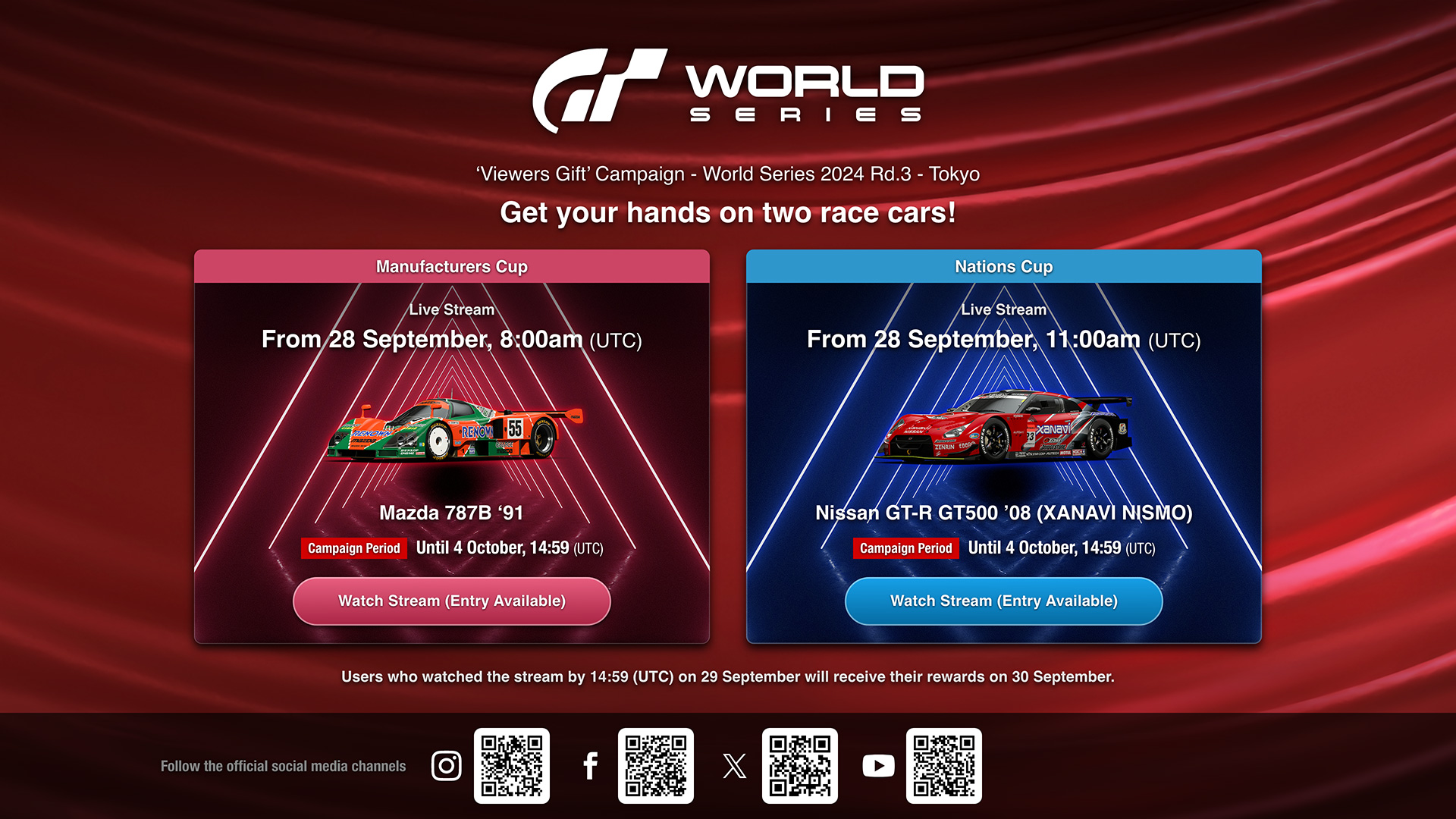 参加Gran Turismo世界系列赛2024第3轮——东京“观赛者礼物”活动,获得两张车辆奖券!