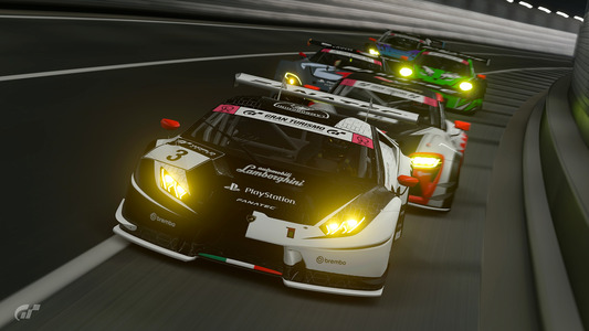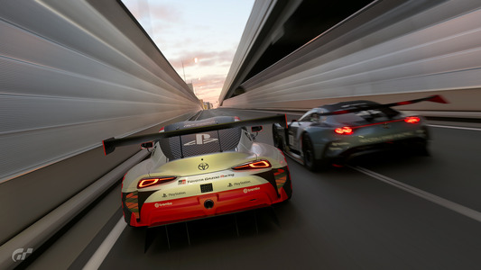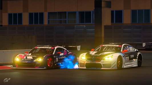 绿旗挥舞的瞬间,赛车一边发出轰鸣声,一边冲出起跑线,保持着整齐有序的队形涌入一号弯。正如预期,到第3圈时,驾驶BMW M6 GT3的铃木圣弥(Half-SpiritCRV86)和驾驶Subaru BRZ GT300的宫园拓真(Kerokkuma_ej20)已经与后方车阵拉开一段距离,建立起超过两秒的领先优势。在他们身后,一场激烈的名次争夺战正在上演,参战者包括驾驶Lexus RC F GT3的川上奏(QTD_Kawakana)、驾驶Porsche 911 RSR的佐藤彰太(anchovy_sand_)、驾驶Toyota Supra的森本健太(HeAvN_RB26)以及驾驶Mazda RX-Vision GT3的国分凉太(Akagi_1942mi)。每位车手都不遗余力、奋勇争先,第3名到最后一名之间的差距仅有几秒之遥,每个弯道的争夺都无比紧张刺激。